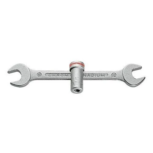 La clé à fourche universelle Express de la marque Rothenberger est conçue pour les installations d’appareils sanitaires, systèmes de chauffage, de climatisation et de ventilation. Elle convient pour les mises en place de raccords d’évier et de vannes d’angle, les montages et fixations de lavabo et robinets. La bille intégrée facilite le serrage de tiges filetées, tandis que le desserrage de la vis hexagonale interne permet de déplacer le boulon de suspension sur l’axe de la clé grâce au levier extra-long. Pour tige M10, pièce centrale avec filetage intérieur.