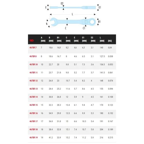 La clé mixte à cliquet 467BF est conçue avec une tête articulée permettant d’atteindre les écrous difficiles d’accès. Son mécanisme à cliquet est compact et est réversible par retournement de la clé.