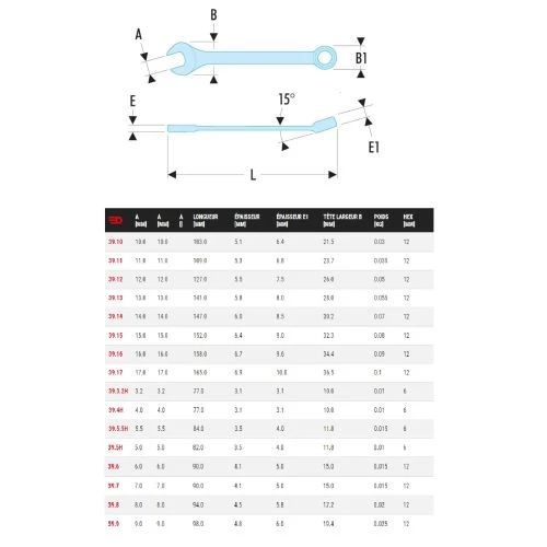 Ces clés mixtes 39 disposent d’un manche court et d’une tête compacte et pratique pour les accès difficiles.