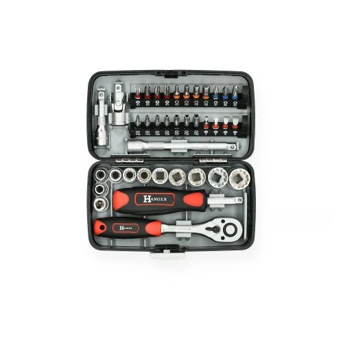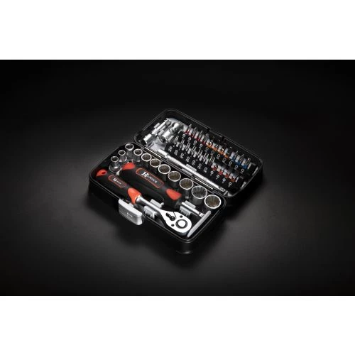 Coffret 38 pièces, cliquet, embouts + douilles de serrage 1/4 ». Par sa compacité, ce coffret vous permettra de gagner de la place dans votre boîte à outils ou de l’emporter dans votre poche lors d’interventions. Boîtier bi-matière soft-touch résistant avec charnières métalliques et fermoir métallique automatique. Pictogrammes des empreintes pour les embouts. Préhension des embouts facilitée par le redressement automatique des barrettes à l’ouverture du coffret.