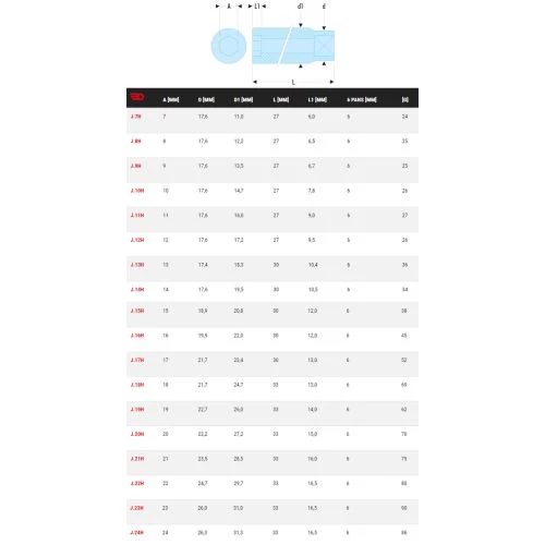 | Diamètre (mm) | 7, 8, 9, 10, 11, 12, 13, 14, 15, 16, 17, 18, 19, 20, 21, 22, 23, 24 |