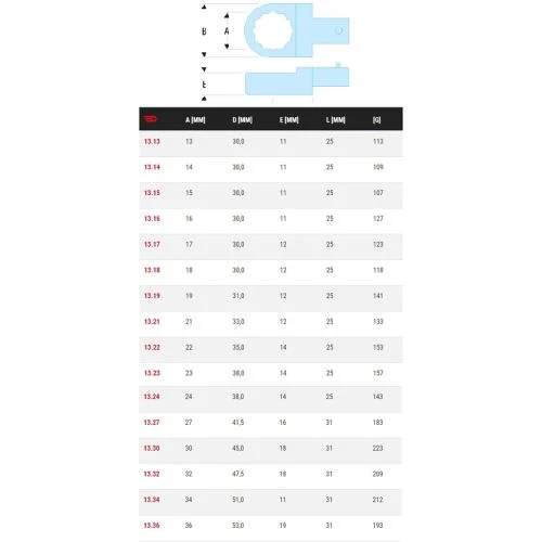 | Diamètre (mm) | 13, 14, 15, 16, 17, 18, 19, 21, 22, 23, 24, 27, 30, 32, 34, 36 |